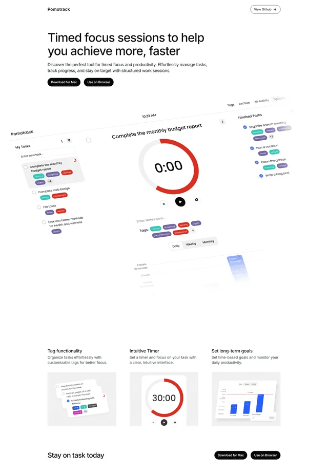 Built with React, Pomodash features a clean, responsive interface designed to minimize distractions while providing powerful productivity tools accessible across devices.